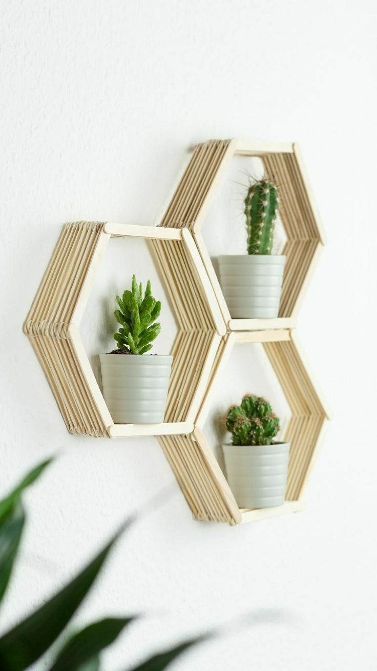Rak berbentuk heksagon tidak hanya berfungsi sebagai tempat menyimpan barang, tetapi juga menjadi elemen dekoratif yang menarik. Bentuknya yang khas membuat ruangan terasa lebih hidup dan tidak membosankan. Keberadaan rak ini juga memanfaatkan dinding yang sebelumnya kosong secara maksimal.
